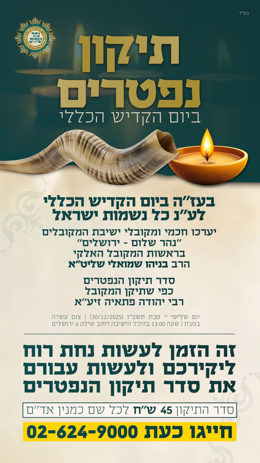 אי״ה, לקראת יום הקדיש הכללי, יתקיים תיקון נפטרים ע״י חכמי ישיבת המקובלים נהר שלום בראשות כבוד מו״ר ראש הישיבה המקובל רבי בניהו שמואלי שליט״א.