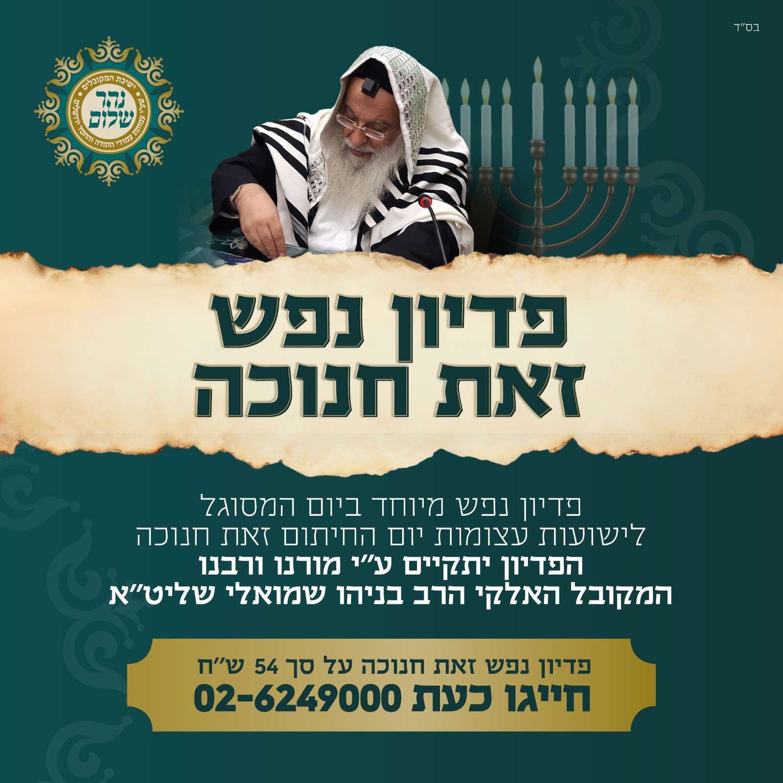 אי"ה יערוך כבוד מורנו ורבנו ראש הישיבה המקובל הצדיק הרב בניהו שמואלי שליט"א פדיון נפש מיוחד היום המסוגל זאת חנוכה העבירו את שמות בני המשפחה לברכה הצלחה וכל הישועות.